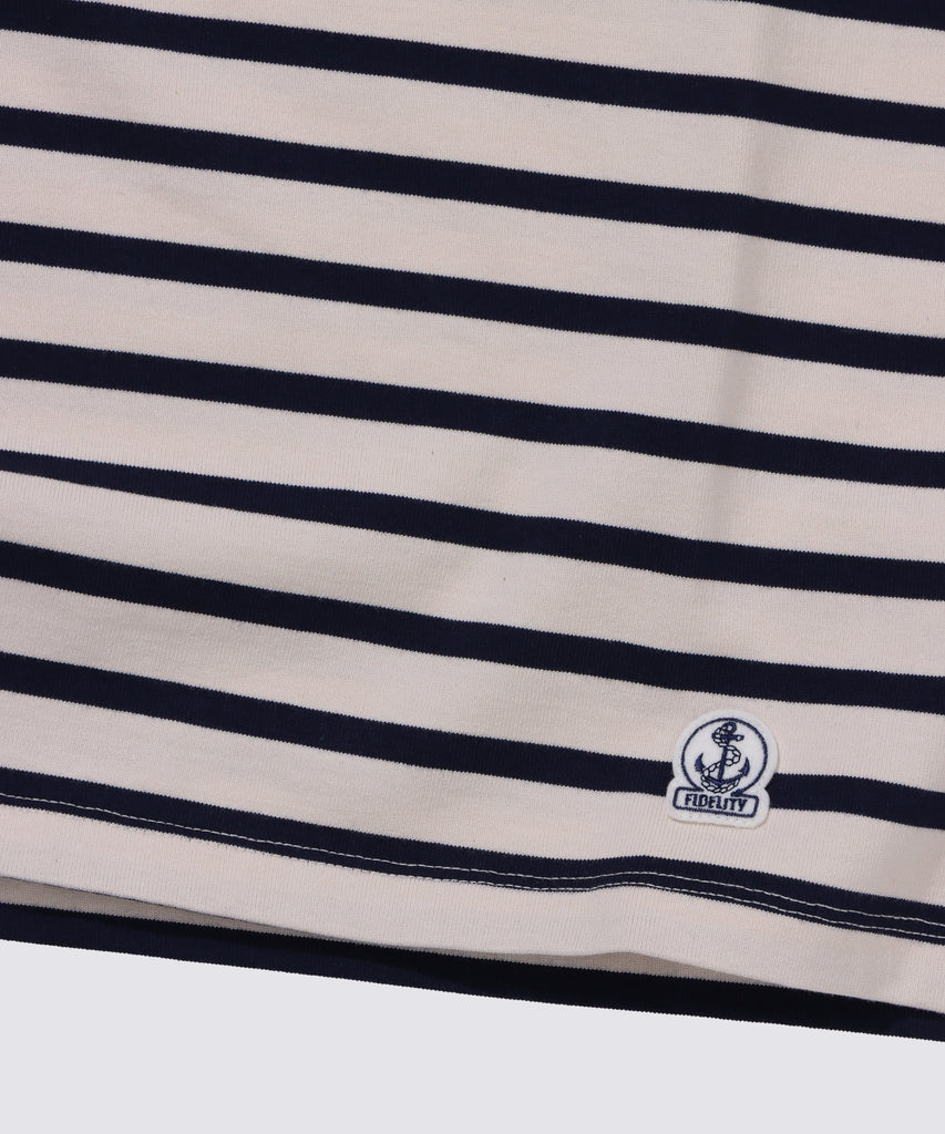 24番手2本使いのヘビーウエイト天竺編みのカットソー地のボーダー。双糸を使用しているので、しっかりとした肉感でありながら、上品な印象に仕上がっています。