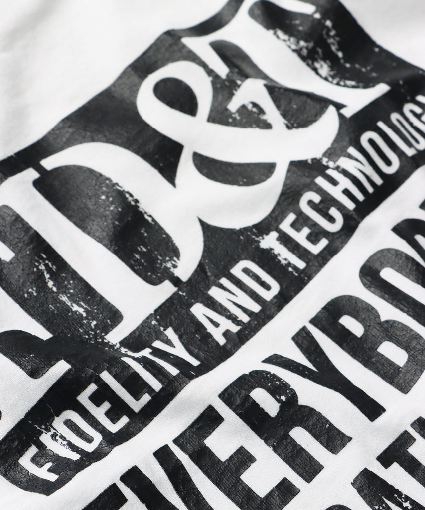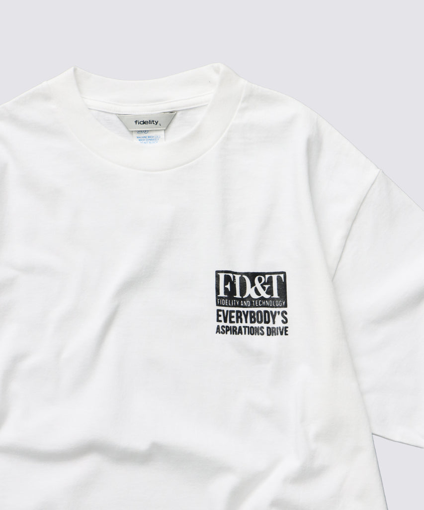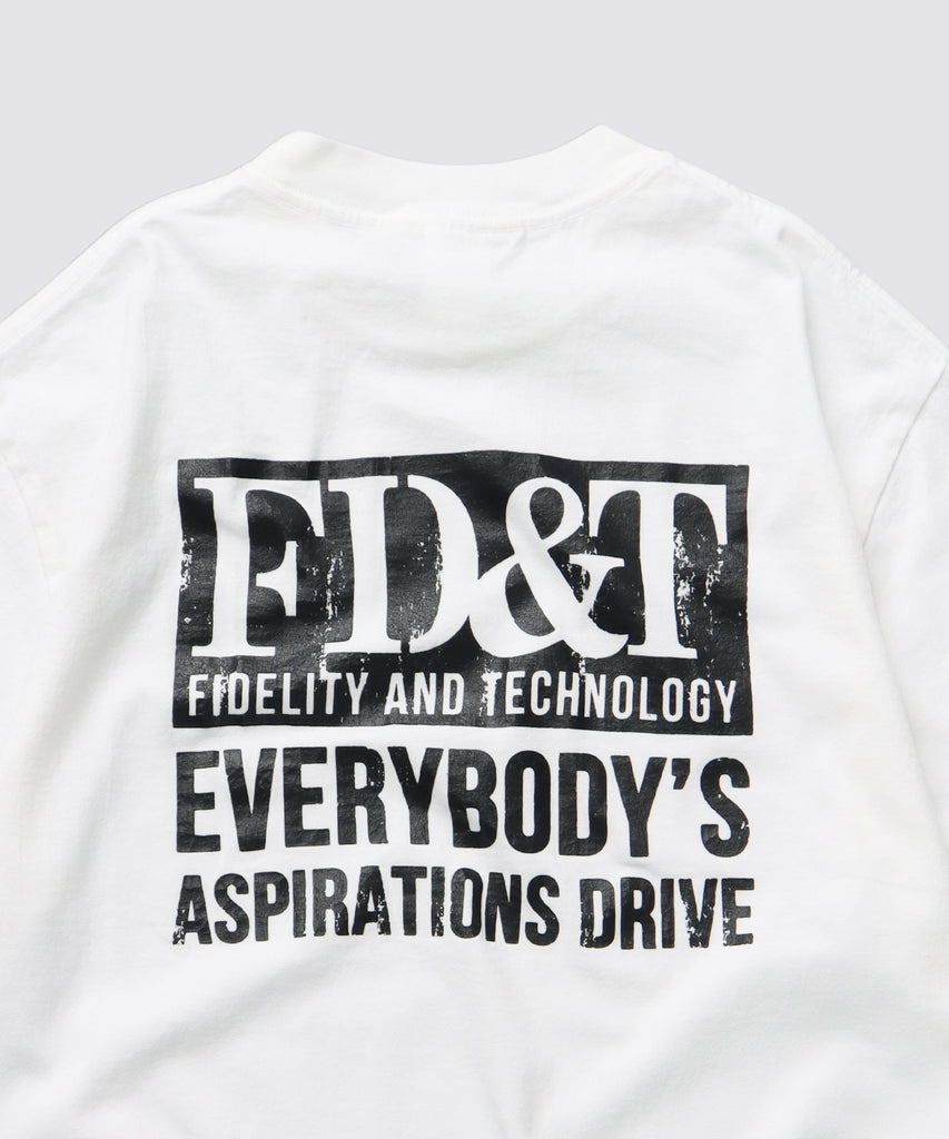 背中で語る、力強いメッセージ。 “FD&T(FIDELITY AND TECHNOLOGY)“のロゴと、“EVERYBODY’ S ASPIRATIONS DRIVE” のメッセージを背面に大きくレイアウトしたバックプリントT シャツです。 フロントはシンプルにロゴのみを配置し、程よい存在感で大人のストリートスタイルにも自然に溶け込みます。