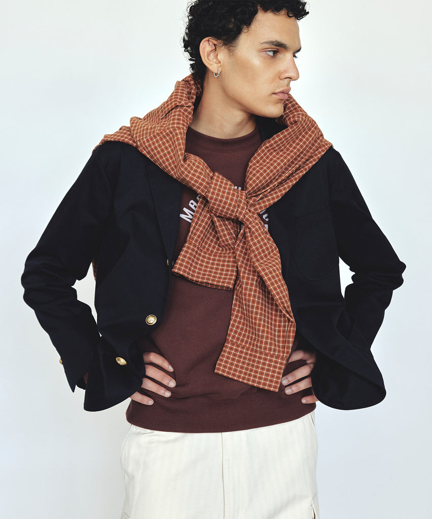 ややオーバーサイズ気味に設計された3ボタン仕様のブレザーは、Tシャツやカットソーに羽織るだけでこなれた雰囲気を演出します。