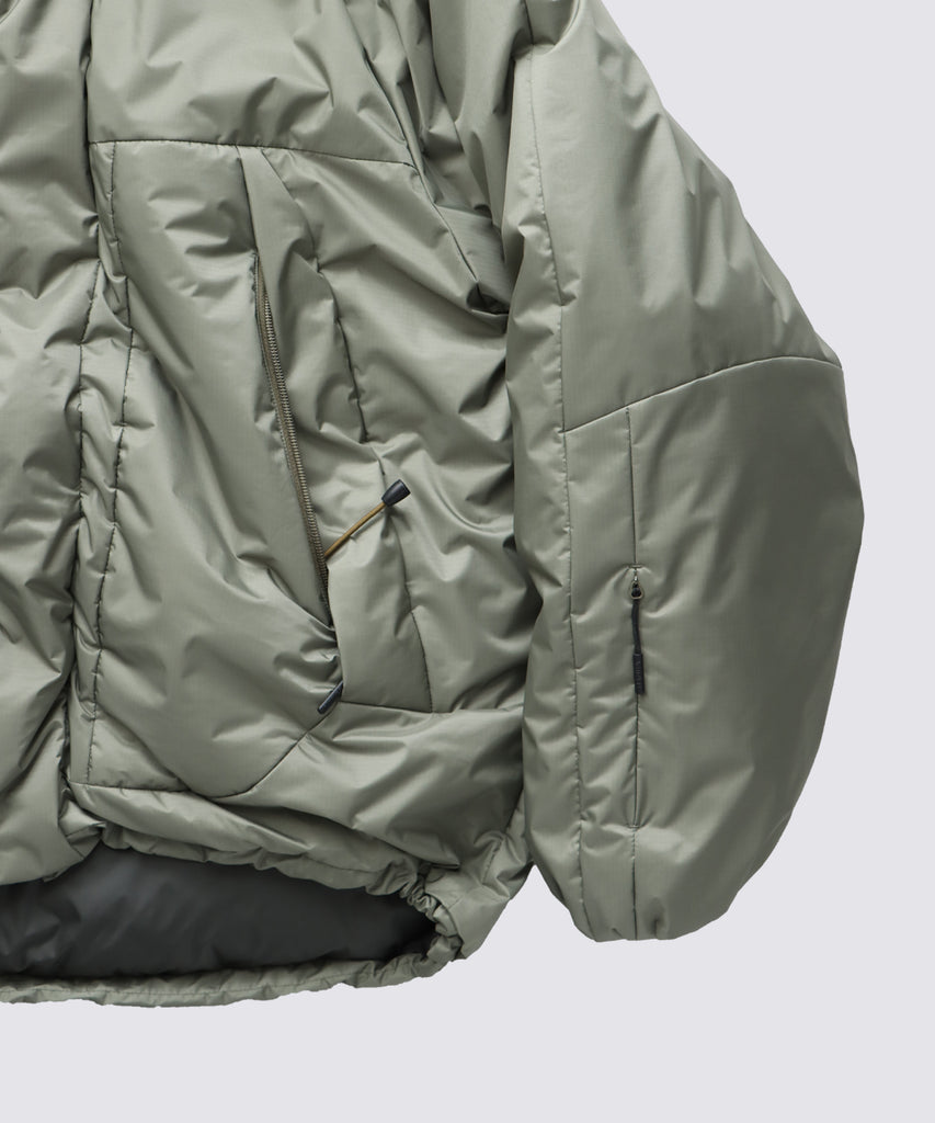 ・ダウンの弱点である水濡れに配慮した高防水性を与えながらも、透湿性を犠牲にしていない素材「AURORA-TEX(オーロラテックス)」多孔質ポリウレタン防水コーティング素材で、透湿・保温・撥水に優れた3レイヤーの高機能ナイロンで天候を気にせずに使えるので、発動の幅が広がる。リップストップなので通常のナイロンに比べ裂き強度が高くアクティブシーンで活躍。