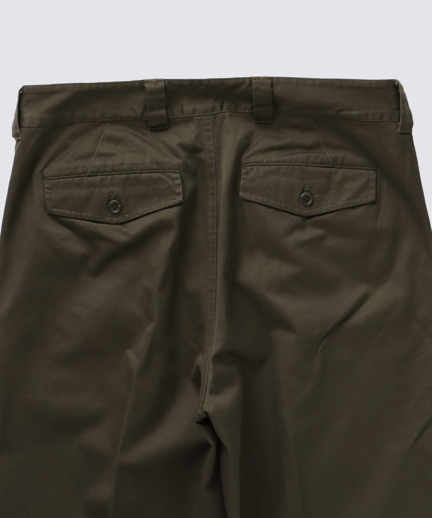 フランス軍のM52チノトラウザーズをベースに、現代的なフィット感とシルエットで再構築した2タック仕様のツイルパンツです。 程よくボリュームのある腰まわりから、裾にかけて落ちるきれいなテーパードラインが特徴で、品のあるミリタリースタイルを演出します。