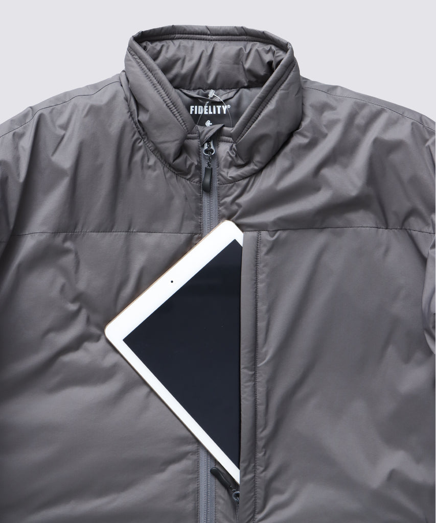 左胸の大きなファスナーポケットはiPadも入る大容量。